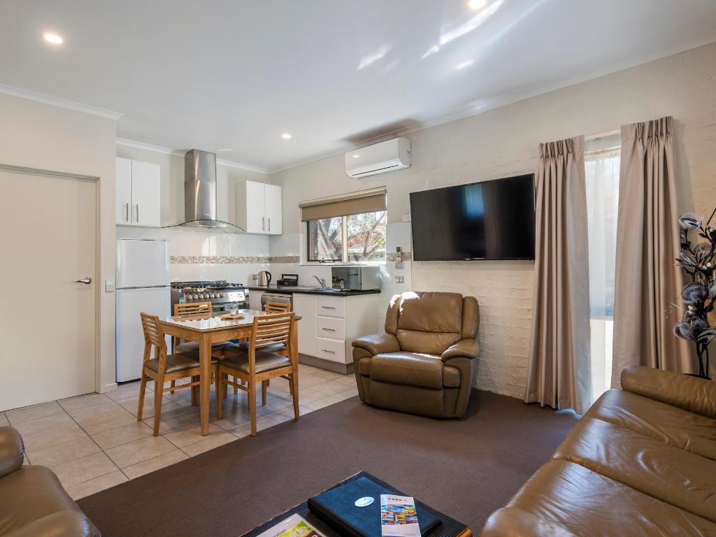 This popular 2 bedroom self contained apartment offers value for travellers seeking quality, modern and comfortable accommodation and amenities. These apartments boasts the luxury of living away from home with all the ultra modern extras. These apartments provide space and comfort for long stays and are perfect for families. With all the features including separate lounge area with a full size reclining lounge suite and large LCD flat screen TV, full functional workstation kitchen with a gas cooktop and a large stainless steel oven, a full size fridge/freezer, microwave and a 5 piece dining suite, a separate laundry with own front loader washer and dryer and laundry sink, a separate bathroom and toilet. These apartments are very well appointed and perfect for those who wish to self cater! These apartments contain 1 Queen pillow top bed in one room and 2 single pillow top beds in the other. Each bedroom also has its own television.